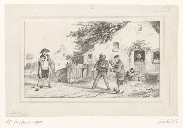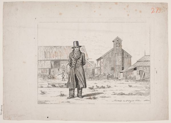 Curator: Let's consider this etching from 1830 by Martinus Rørbye. The title translates to "Peter Collet at the Copperworks Buskerud in Norway". It’s held here at the SMK. Editor: It has a striking stillness, almost theatrical. The dark lines create a somber tone, though the ducks waddling about add a touch of mundane realism. Is Peter Collet perhaps observing his own dominion? Curator: He was the owner of this copperworks. Rørbye portrays him not as a man of labor, but of capital, standing separate yet integral to the site. The backdrop reveals much activity, placing Collet within a visual narrative of industry. Editor: I see a romanticised hierarchy. The workers are diminutive and part of the broader landscape of production, whilst Collet commands a powerful foreground, aloof in his top hat and greatcoat. What message did this hierarchy send, and for whom? Curator: The Romantic movement influenced depictions of industry at the time, often presenting landscapes in a way that glossed over the harsh realities for the laboring class. However, it is a business portrait commissioned, likely meant for Collet’s private appreciation of the work. Editor: Exactly. It perpetuates a narrative of idyllic industry with no grit, soot, or real human struggle, though the workers in the background did contribute to the country’s economic expansion and deserve an appreciation and recognition beyond the aesthetic industrialization. It shows that even in what seems like neutral portraiture, one can observe existing sociopolitical norms. Curator: It is an interesting exercise to place it in the context of visual representations of labor, which would undergo radical shifts. This piece reveals how social position could be encoded through artistic representation. Editor: And invites us to consider whose stories are amplified, or obscured, in the narratives that shape our understanding of history. Curator: Absolutely, an etching such as this, then, is not a mirror but a refracting lens for the cultural forces at work.