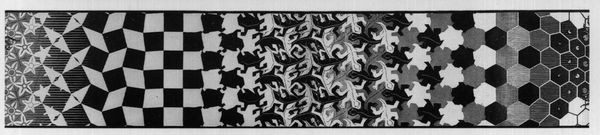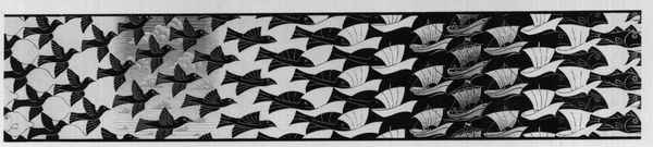 M.C. Escher made this woodcut of insects becoming fish with, I assume, a knife and gouges. It's all about how a mark, repeated, can become something else. A hexagon becomes a bee, then a bat-like insect, and finally, a fish. There’s a kind of magic to how Escher manages to morph these figures so seamlessly. It’s a testament to his deep understanding of form, surface, and pattern. What starts as a rigid, geometric structure slowly melts into organic shapes. Look at the way the dark spaces between the bees’ wings gradually fill in, transforming into the bodies of the fish. It’s almost like a visual game of telephone, where each shape whispers its secrets to the next. I see a dialogue with artists like Josef Albers, who played with geometric forms, but Escher also brings something completely unique, a real playfulness. It reminds us that art is always an ongoing conversation. You can see that Escher relishes the ambiguity and endless possibilities in that exchange.