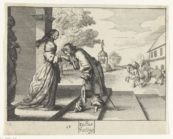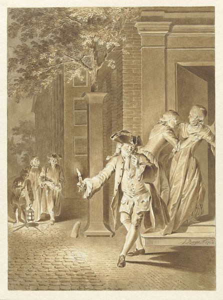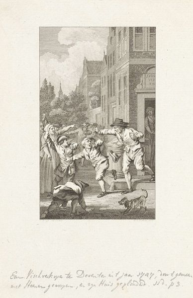 Editor: We're looking at "The Homecoming of Two Members of the Circle of Friends," made between 1751 and 1799 by Jacob Cats. It's an etching done with ink. The scene feels so alive, almost like a snapshot of everyday life in that era. What stands out to you in this work? Curator: It’s interesting you say that. Genre paintings like this served a specific social function. They weren't just documenting life; they were shaping ideas about proper conduct, family, and community. What do you notice about the architecture, the setting itself? Editor: Well, it seems like an affluent neighborhood, with the carriage and the well-maintained buildings. Does the setting tell us anything about the intended audience? Curator: Precisely. These genre scenes were popular among the emerging middle class. The artwork's setting provided them with aspirational imagery, presenting ideals of domesticity and social interaction they wished to emulate. And notice the dog—how is it positioned in relation to the returning men? Editor: It's right at their feet, loyal and welcoming. Would that loyalty translate symbolically to ideas around citizenship at that time? Curator: Possibly. The imagery reinforces notions of social order. But consider too the role of the 'circle of friends' mentioned in the title. How do such social circles influence artistic patronage? Editor: It suggests art wasn't always made in isolation. These networks helped artists find commissions and exposure. It puts the "romanticism" tag in perspective; it's not just emotional expression, but also a reflection on specific social circles. Curator: Exactly. It reminds us that even seemingly personal artworks are deeply embedded in social and economic systems. Editor: I see this piece so differently now. It's not just a charming depiction, it's a cultural artifact shaped by and shaping the values of its time. Curator: Indeed, and it also provides a window into understanding the role of art as a social practice, not just an individual one.