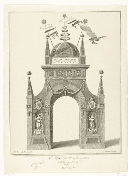 Curator: This delicate drawing captures a fleeting moment of public celebration in Breda: the entry of Willem IV and his consort in 1737. Note the intricate detail, quite remarkable for a temporary structure. Editor: Yes, there's a strong sense of lightness to it, even delicacy, despite the monumental subject. The hatching is exquisite, almost like fine lace. It draws you in for closer examination. Curator: That lightness is interesting, given that these temporary triumphal arches served a very deliberate political purpose. They visually asserted the power and legitimacy of the House of Orange. The imagery—the banners, the Latin inscription “Virtus Unita Valet” which is something along the lines of ‘Strength United Prevails’ all point to a carefully constructed message for the public. Editor: Precisely, that inscription becomes part of the form; it echoes the curve of the arch, and provides a horizontal thrust that really strengthens the composition visually. It keeps the eye moving. There is also some lovely detail above that, it appears the Arch is adorned with statuettes on each side and some royal insignia on the keystone. Curator: Absolutely, these events were carefully orchestrated displays of power. Cities would invest heavily in these temporary constructions to demonstrate loyalty and secure favor with the ruling family. It was a transaction as much as it was a celebration. Think of the economic impact; local artisans, merchants, and performers would all benefit. Editor: And yet, the drawing style lends a certain timelessness to it. One could see it purely for the symmetry and line work; one forgets the propaganda aspect after a few minutes and begins to feel this could be any time. The technique itself is so clean, the balance is nearly perfect in this pen illustration. Curator: True, that visual harmony also served to reinforce the image of stability and good governance the Orange dynasty sought to project. I now think this drawing may have been a study for something grander, perhaps the engraving of the event used for distribution afterwards. Editor: I had not considered this possibility, but you are likely spot on. Now I see its purpose, the artwork provides an incredible insight into an architectural object and social performance.