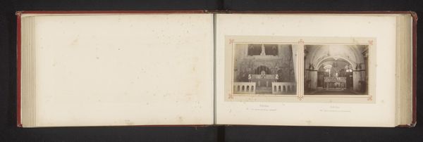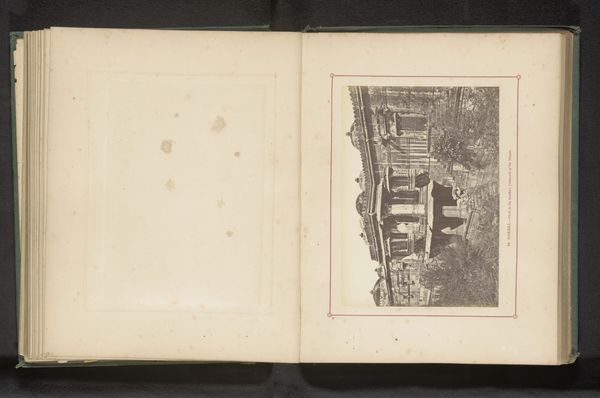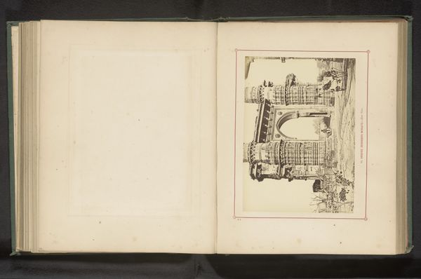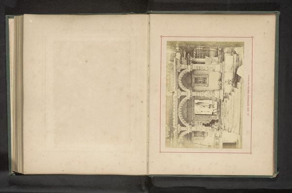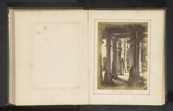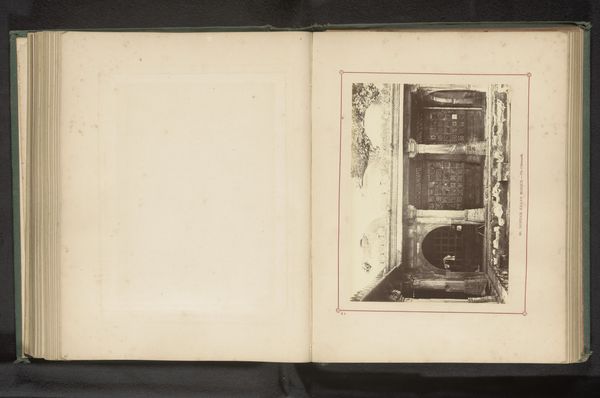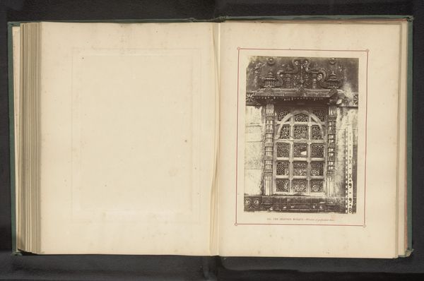 Editor: Here we have an albumen print from before 1866 by Thomas Biggs, titled "Poort tussen de tombe van Mahmud Begada en de tombe van zijn vrouw op Sarkhej Roza bij Ahmedabad," which translates to "Gate between the tomb of Mahmud Begada and the tomb of his wife at Sarkhej Roza near Ahmedabad." It's presented within what looks like a personal sketchbook. What immediately strikes me is the architectural detail; it's so intricate, despite the print's age. What aspects of the composition capture your attention? Curator: The relationship between positive and negative space is particularly compelling. Note how the architectonic forms – the gate, the domes, the pillars – are not merely objects, but generate intervals of space around and through them, shaping our perception. The photographer seems less interested in mimetic representation than in exploring the interplay of mass and void. How might the tonal range, from the deepest shadows to the subtle highlights, contribute to this effect? Editor: I see what you mean. The shadows give it depth and contrast and define those architectural forms, right? The columns are brought out through the highlights and shaded portions... it makes the building almost feel more three-dimensional. Curator: Precisely. Observe also the verticality established by the pillars. This vertical thrust is counteracted by the horizontal extension of the gateway. Are we encouraged, therefore, to meditate on tensions within this structure? On containment versus expansion? Editor: It is almost a pushing upward, yet being kept stable and solid, still. Now I see why you said 'tensions'. It's beautiful how much a photo like this captures with composition alone. Thanks! Curator: Indeed, an understanding of the visual elements reveals new dimensions within the work. My pleasure.