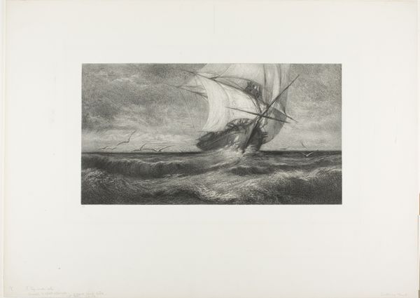 Editor: So, this drawing here is called "The Phantom Vessel," made in 1872 by Théophile Chauvel. Looking at it, I'm struck by how turbulent everything seems – the sea, the sky – even though it's just pencil on paper. What captures your attention in this piece? Curator: Well, my dear, it's that feeling, isn’t it? That sublime terror only the Romantics could truly grasp. The vessel, more suggestion than solid thing, becomes a metaphor for our own fleeting existence amidst the grand chaos. Do you notice how the dark lines churn in the water? Editor: I do. It’s almost overwhelming; it definitely emphasizes that feeling of being small against nature. Is that typical for Chauvel? Curator: In a way, yes, as in, I don't know for certain. Artists play with ideas like these. He was deeply inspired by marine painting and Romanticism so perhaps yes. Think Turner, think Delacroix – they wrestled with similar themes. That being said, how does it speak to you beyond its technical brilliance? Editor: I guess I was just focused on the ship at first, but now seeing it more as a feeling of being alive. Even facing difficulty or death. Like the vessel braving the storm… Curator: Exactly! You know I always feel an echo of that quote: "We are all in the gutter, but some of us are looking at the stars”. A storm it is, in the end; beauty is still beauty. A powerful reflection to take with us, eh? Editor: It definitely is. Now, I understand what makes the artist more special in his historical context, like a hidden part that now speaks clearly! Thanks.