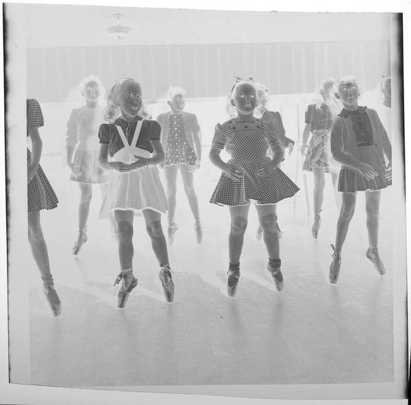 Curator: I'm captivated by this gelatin silver print from Jack Gould, showing young ballet dancers "en pointe." It's so small, almost like a dream captured in a square. Editor: It's ghostly! That inversion of tone gives the ballet class a kind of ethereal quality. The material of the print itself contributes to that effect, don't you think? Curator: Absolutely! The dance studio becomes this strange, upside-down world. They appear weightless, these little dancers. Editor: And what about their dresses? Look at the labor sewn into each one, the material that defines each child’s status and participation. Curator: I see that, it makes me wonder about the girls' aspirations. I like how Gould uses the negative image to turn the familiar scene into something surreal. Editor: I agree! The materiality of the image and the materials of the dresses open up a dialogue about labor and performance in unexpected ways. Curator: It's quite beautiful how such a small object can suggest so much about childhood and the pursuit of beauty, though. Editor: It truly captures the material reality and the dream-like quality of ballet all at once.