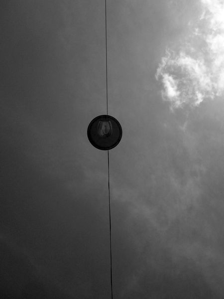 Editor: Alfred Freddy Krupa’s black and white photograph, “The Lamp and the Clouds,” made in 2017, is remarkably serene. The geometric lines of the telephone pole contrast nicely with the ethereal clouds. What strikes you most about this piece? Curator: This image really speaks to our relationship with the environment. It captures the often overlooked intersections of industrial and natural landscapes. What are the power dynamics at play here? We see these wispy clouds, signs of our Anthropocene, almost as fleeting graffiti on the canvas of the sky, right? Editor: Graffiti? That's an interesting way to look at the clouds... I hadn't thought of it like that before. Curator: Consider also, the pole, this symbol of connectivity but also of control and surveillance. The photograph becomes a silent commentary on how human intervention shapes our perception of the 'natural' world. How do you think Krupa situates himself, and therefore, us, as the viewer, within this conversation? Is it critical, complicit, or something else entirely? Editor: It definitely makes me think more critically about how we interact with the landscape. The placement of the lamp, almost pointing towards the heavens, suggests we’re trying to illuminate, perhaps even control, something beyond our grasp. Curator: Exactly! It's a delicate balance of aesthetics and social commentary. I think this photo subtly prompts questions about the ethics of development and our ever-evolving understanding of nature versus culture. What’s the feeling left with you, after considering all this? Editor: A sense of uneasy calm, almost. It's beautiful but also a little unsettling knowing what's underneath the surface. Thank you for showing me that!