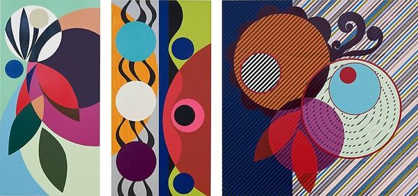 Curator: Looking at Beatriz Milhazes' 2009 piece, "Cinnamon," I'm struck by the exuberance of it. It feels like a visual explosion. Editor: Visually, the word that leaps to mind is "carnival." The high-key colors and swirling forms suggest celebration and playful chaos, don’t they? Curator: Precisely! Milhazes' works often tap into the festive imagery of her Brazilian heritage, especially Carnival. Her circles, floral motifs, and layered geometries recall the intricate decorations and vibrant costumes of these celebrations. It's like she's translating the energy of a cultural event onto the canvas with these bold acrylic paints. Editor: Indeed, the geometries at play here create interesting tensions. The composition's clear structural divisions feel like stage sets for the biomorphic shapes to act upon. It brings to mind a semiotic reading of culture itself being composed from discrete blocks or forms, however playful, always in structured arrangement to a cultural order. Curator: That's fascinating, viewing culture as these visual semantics. The concentric circles, often repeated in her work, might represent cycles of life, renewal, or perhaps even spiritual concepts of wholeness. They feel like mandalas reinterpreted through a distinctly Brazilian lens. Editor: I hadn't considered the cyclical element explicitly, but it makes sense given the overlapping of colors and how certain forms re-emerge throughout. It does give the painting a vibrant kind of dynamism and unity when, strictly formally speaking, each quadrant seems on its own distinct adventure. Curator: Thinking about cultural memory and continuity, the piece demonstrates an integration between European modernism with Brazil’s indigenous and folk art traditions. These visual traditions become like palimpsests—where historical elements remain present, though constantly renegotiated into new meanings and new compositions. Editor: A great perspective, thinking of the painting as a revision, always referencing other histories while also staking out new territory. I’m especially taken by how her visual vocabulary manages to be so joyous and erudite at once. Curator: It certainly feels both celebratory and insightful! A real testament to the power of cultural synthesis, and the expressive qualities of visual language itself. Editor: I couldn’t agree more. I think "Cinnamon" presents us with a joyous exploration of forms, colors, and concepts that linger in the mind, almost as powerfully as a taste.