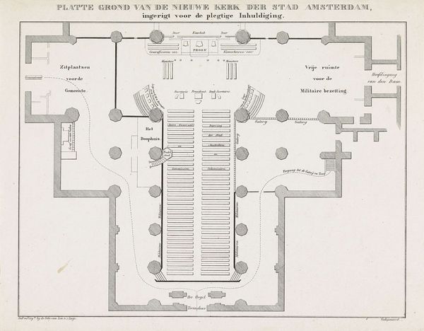 This is a plan of the Nieuwe Kerk in Amsterdam, made by the Van Lier brothers in 1840. It meticulously maps out the space for the inauguration of King Willem II. The printmaking process is key here. Notice the fine lines achieved through etching or engraving, both labor-intensive techniques that were crucial for disseminating information in the pre-photographic era. This wasn't just about art; it was about civic engagement and documenting a significant event. The plan details the seating arrangements, separating the elites from the public. The level of detail reveals much about the social hierarchies of the time, where even within a sacred space, visibility and proximity to power were carefully orchestrated. The map isn't just an aesthetic object; it's a diagram of social order, reflecting the political landscape of 19th-century Netherlands. By considering the materials and making of this print, we move beyond aesthetics to understand its role in shaping social consciousness and documenting a pivotal moment in Dutch history.