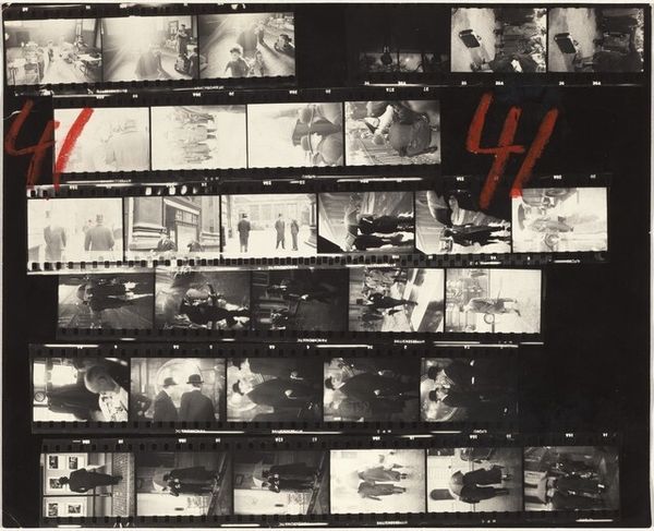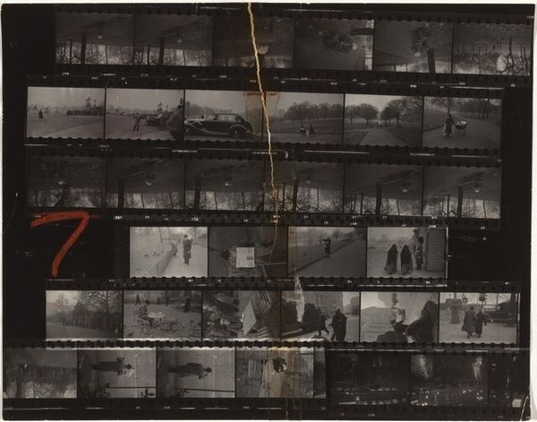Curator: Well, here we have Robert Frank’s "London 38," a gelatin silver print created between 1952 and 1953. It's fascinating to consider this work through the lens of post-war identity formation. Editor: My first thought? Intensely melancholic. All those grainy black and white vignettes... feels like snippets of forgotten dreams. Sooty London, bottled up and slightly unsettling. Curator: Precisely. Frank's approach can be read as a critical commentary on the social fabric of London at that time. Consider the ways urban alienation is visually manifested here – a palpable sense of distance despite being in close proximity. The people, though present, appear isolated. This is heightened, I believe, by the photographic method itself. Editor: You're right. There's a detachment—an almost voyeuristic quality, as if Frank were a ghost drifting through the streets. The contrast between the gritty realism and this detached, dreamlike quality is mesmerizing and even eerie. It definitely steers away from postcard perfection! It's got that authentic aftertaste—slightly bitter. Curator: And that bitterness, as you call it, speaks volumes. We should also note the political undercurrents present—a visual record reflecting the anxieties around class and social mobility in the post-war era. Editor: Yes! You're right on the money. These photographs aren't trying to prettify anything. They show us the quiet, almost shameful bits. I’m thinking now how interesting this approach would have been—boldly cutting through the typical images of a proud and polished London, fresh after its Blitz spirit phase! Curator: Absolutely. "London 38" offers an important contribution, a study in human disconnection set against the backdrop of a recovering city, urging us to re-evaluate our perception of urban experience in the context of collective historical traumas. Editor: This silver gelatin print definitely invites you into another London; dark, yes, and complicated, sure…but hauntingly real. I keep wanting to spend more time teasing its stories, you know?