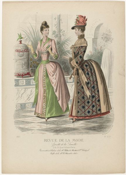 This fashion plate, created by Cholet in May 1898, depicts the height of Parisian fashion. The striking striped patterns on the dresses are more than mere decoration; they are symbolic of order, status, and modernity. The lines evoke a sense of structure, reminiscent of the architectural feats of the era, such as iron constructions like the Eiffel Tower. One might recall the ancient Roman toga, where the arrangement of folds and fabric similarly denoted social rank. Here, these vertical lines elongate and refine the silhouette, symbolizing a progressive era. Observe the woman reading the letter. Note how this gesture recalls countless depictions of the Annunciation. Through these visual echoes, we subconsciously connect with themes of destiny and revelation. The letter as a carrier of personal narrative—a motif that continues to resurface in our collective memory and evolves in meaning across time.