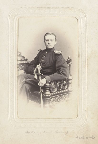 This photograph of an unknown young man in uniform was made by W.G. Kuijer & Zonen in Amsterdam. It’s a small-scale print, likely made through an albumen printing process, where paper is coated with egg white and silver nitrate, then exposed to light through a negative. In this era, photography was becoming more accessible, yet remained a specialized craft. The photographer's skill was in controlling the chemical processes and lighting to create a clear image and flattering portrait. The material and making of this photograph reflect the values of the time, where precision, and attention to detail, were highly prized. Photography democratized portraiture, yet also captured social hierarchies, evidenced by the young man's military uniform and dignified pose. The labor involved, from preparing the chemicals to posing the subject, speaks to the cultural and economic context of the late 19th century. Considering the materials and making of this photograph allows us to appreciate its cultural significance, and reminds us that photography, like any other art form, is shaped by the social and technological forces of its time.