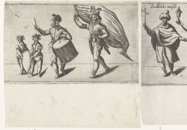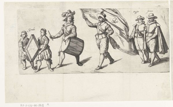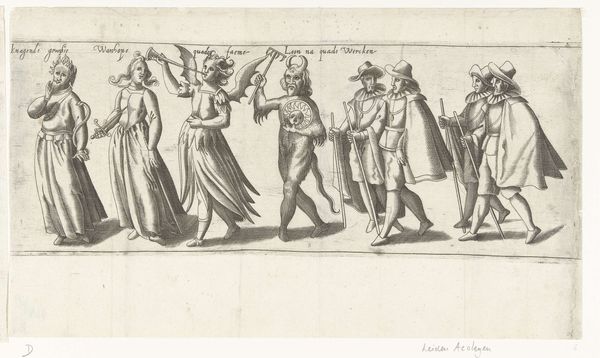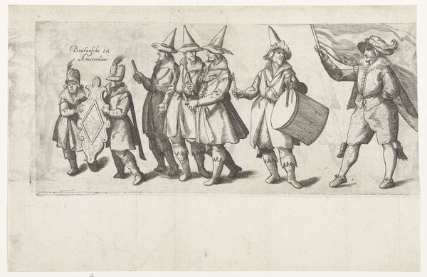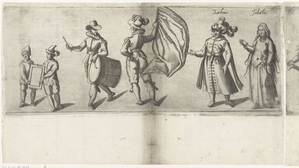Editor: This is part one of "Procession of the Chamber of Rhetoric Den Aeckerboom from Vlaardingen," created in 1607. The artist is unknown, and it’s an etching. I am really drawn to the almost theatrical quality, the way the figures seem to be performing for us. How would you interpret this work? Curator: I see a fascinating tapestry of symbolic figures frozen in time, carrying cultural memory on their sleeves – quite literally, with those costumes! Consider the figure holding what looks like a caduceus, a staff entwined with serpents; traditionally, it's associated with Hermes, or Mercury, representing commerce and negotiation. What might its presence suggest about the Rhetoric Chamber's activities? Editor: Perhaps they saw themselves as mediators or facilitators within their community? Curator: Precisely. And what about the masked figure? Masks are transformative objects, right? They simultaneously conceal and reveal. What could it suggest about performance and identity? Editor: Maybe it indicates the adoption of different roles or personas within the Chamber's theatrical productions or civic duties? Or simply that plays were a big thing for them? Curator: Yes! Their entire parade, and representation, is a type of performance itself, reflecting shared values and aspirations of Vlaardingen. How about the text being carried on the sign... how could text itself become an icon? Editor: I never thought of text as being an icon, I suppose that sometimes text has to do double duty as the thing itself, and also what is represented. Thank you. Curator: It also made me look at iconography with fresh eyes, thinking more about hidden or esoteric meanings. It seems to work!
