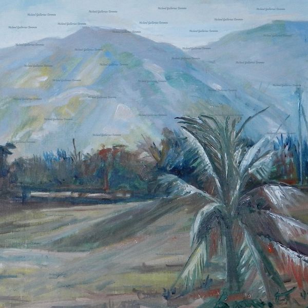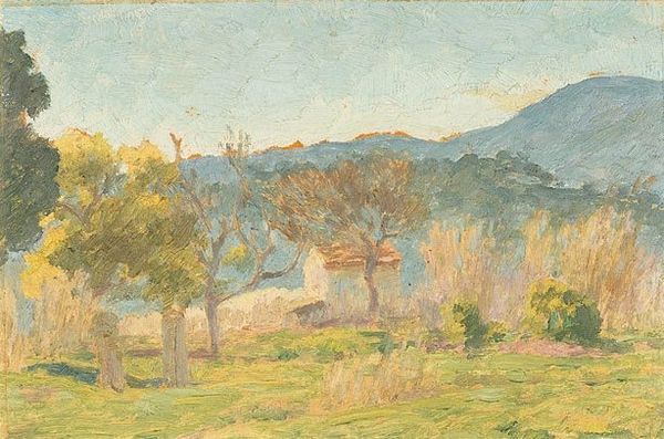 Editor: This is "Fique Landscape" by Rafael Zabaleta, it's a watercolor painting, though the information about its exact date is missing. I am immediately drawn to how the artist uses colors and forms; what really stands out is how light and airy it all feels despite the rugged mountain looming in the background. How do you interpret this work? Curator: I agree; observe how the artist employs short, broken brushstrokes to construct form. Note especially the analogous color scheme – yellows, greens, blues – which creates a harmonious visual experience and reinforces the feeling of unity. Are you struck by how the artist manages the relationship between the foreground and the background? Editor: Yes, actually. The details in the foreground are far more pronounced and, thus, it's much easier to tell what objects they are. Is it fair to say the work uses perspective in unusual ways? Curator: Indeed. The artist departs from strict linear perspective, choosing instead to flatten the picture plane. This imbues the landscape with a decorative quality and invites the viewer to appreciate the painting as a constructed image rather than a window onto reality. Do you observe how line also delineates the planes in a sophisticated way? Editor: Now that you mention it, I can really see that with the trees and mountain against the sky. Thanks to this conversation, it feels more intentional now. I didn’t pick that up at first. Curator: Precisely. Consider how these formal choices create meaning and engage the viewer aesthetically, and our conversation has come to fruition.