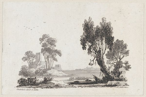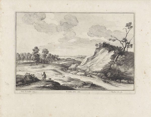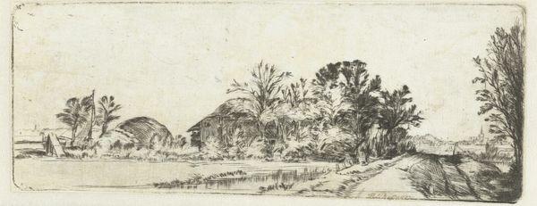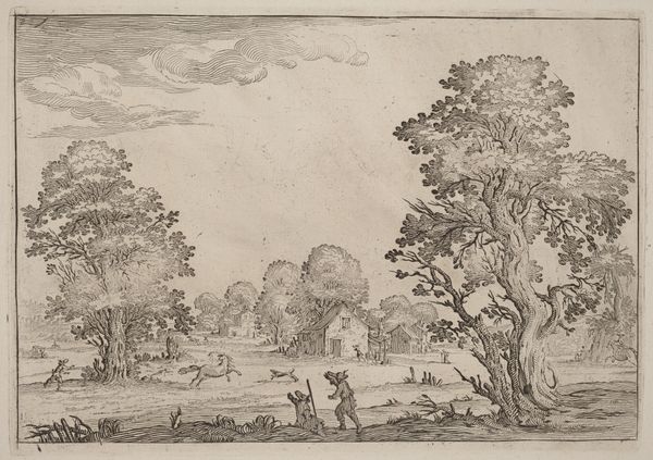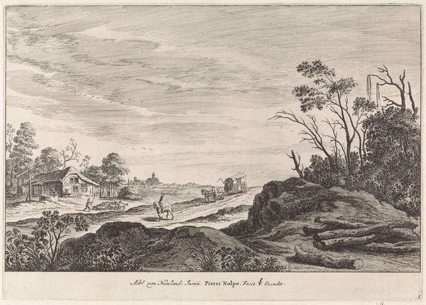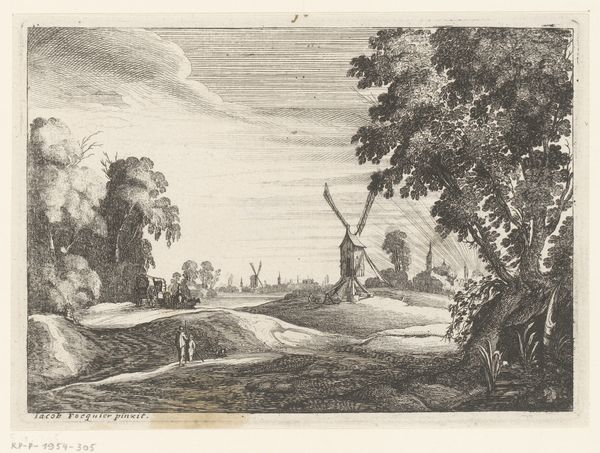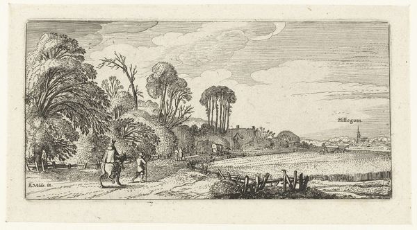 Editor: This is *Wanderers on a Road near Hillegom* by Esaias van de Velde, dating back to 1615-1616. It's rendered in ink on paper and has a definite peaceful quality, like a Sunday afternoon stroll. What do you make of it? Curator: Peaceful indeed! The stillness of the countryside, the casual amble of the figures… it's deceptively simple, wouldn't you say? Look how Van de Velde uses line to create a sense of depth, almost like a stage set, with the cityscape fading into the horizon. Are those birds I spy overhead? Ah, the little touches... The charm's in the details. Editor: It almost feels like a snapshot, capturing a fleeting moment in time. Curator: Exactly! And consider the context: this was a period of immense change in the Netherlands, the Dutch Golden Age just kicking off. Landscape wasn't just scenery, you know? It reflected a growing sense of national identity, pride in the land itself. See the church steeple? Editor: I do. A connection with the world. How much does the Mannerism style of the time fit with the artist's use of Realism? Curator: Good eye! I detect it more as a foundational grounding - mannerism can seem more playful and exaggerated by comparison to later approaches, a springboard from which this image builds with detail. How does realism make you feel when set into that past context? Editor: Maybe realism offered more down to earth options to the artists than mannerism ever could. That the common person finally became the focus in art like this, for instance! Curator: Precisely! Van de Velde has you walking that path, hasn't he? It feels contemporary in it's depiction. The image feels more lived in and authentic. The best art really does hold up. It speaks to us across time, don't you agree? Editor: Absolutely. I’m seeing this work in a completely different light now, thank you. Curator: My pleasure, always a delight!