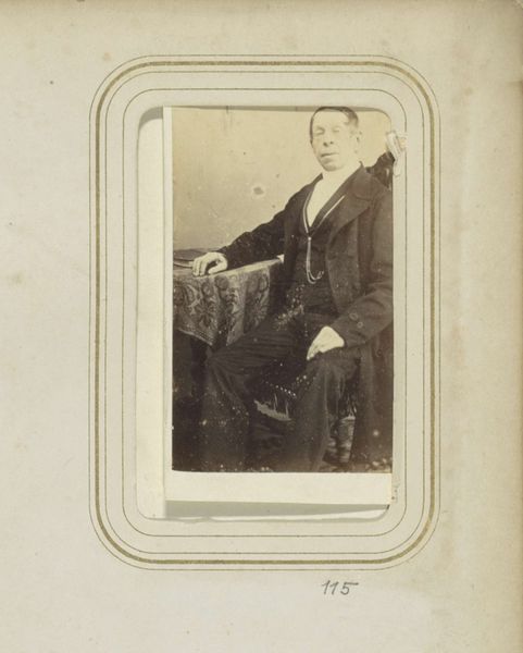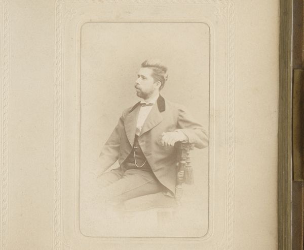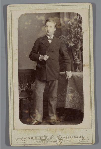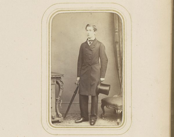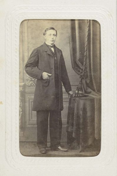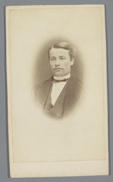 Editor: Here we have "Portret van een staande jonge man," a gelatin silver print from somewhere between 1861 and 1887, currently held at the Rijksmuseum, and credited to Albert Greiner. It's... sepia-toned, and the young man's posture feels so stiff. I wonder, looking at the way the tones blend almost seamlessly, what do you see in this portrait? Curator: Immediately, I am drawn to the geometry of the oval frame. It neatly contains the subject, allowing the eye to focus solely on the tonal gradations within the depicted scene. Note how the light catches the young man's face, directing our attention, and the subtle mirroring effect of his suit’s color with the background, flattening the depth. What does this compositional choice convey? Editor: Perhaps it emphasizes the artificiality of the portrait? He's separate from reality, a constructed image? Curator: Precisely. Further, examine the texture of the gelatin silver print itself. The subtle grain adds a layer of complexity, preventing it from becoming a mere representation. Do you think this affects its meaning? Editor: It adds to the feeling that it's an artifact, something removed from the present. Curator: A very insightful observation. By focusing on the material qualities and compositional elements, we reveal the photograph’s artifice. These formal properties highlight how the portrait constructs rather than simply reflects reality. Editor: It’s amazing how much the texture and even the frame change my reading of the whole image. Curator: Indeed. Focusing on formal elements, independent of historical narrative, invites viewers to ask: What *is* portraiture, truly?