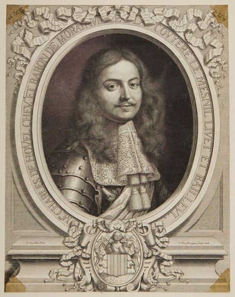 Curator: Take a moment to consider this print, "John Hampden" by Jacobus Houbraken, currently residing here at the Harvard Art Museums. Editor: There’s a quiet dignity about him, but also a bit of steel. I love how the armor hints at a life beyond just sitting for portraits. Curator: Absolutely. Houbraken really plays with the textures of the printmaking process here, using etching and engraving to differentiate between the smoothness of the face and the sheen of the armor. The print is interesting, a reminder of how images circulated and were consumed as political currency. Editor: It's like he's caught between worlds—the refined artistry of the oval frame and the bloody battle scene at the bottom. You see the Magna Carta there too. It grounds Hampden’s defiance in something bigger than himself, doesn’t it? A fight for fundamental rights. Curator: Precisely. And by circulating this image, Houbraken participates in a longer conversation about the relationship between governance, representation, and the rights of individuals. The print acts as both art object and artifact, reflecting its historical moment. Editor: It's a powerful thing, to see someone who stood for something, immortalized like this, wrestling with the very ideas that defined their time. Makes me think about the battles we’re still fighting today.