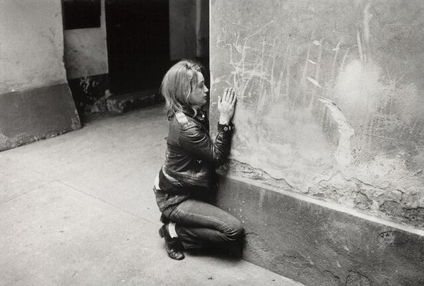 Editor: Roger Mayne's gelatin silver print, "Children in a Bombed Building," created in 1954, has such stark contrasts. I'm struck by how the composition uses the wall as almost an oppressive background. What stands out to you when you look at this photograph? Curator: Immediately, I note the stark contrast you mentioned, which creates a spatial tension within the frame. Observe how the geometry of the bombed wall—its fractured surfaces and jagged edges—competes with the rounded forms of the children's bodies. Consider, also, the use of monochrome; the shades of gray flatten the scene and contribute to its melancholic tone, while enhancing its formal structure. What do you make of their postures? Editor: The child climbing appears trapped, maybe even defiant, while the other seems to reach out, either in support or trying to escape? Their gestures seem crucial to the overall meaning, don't they? Curator: Indeed. Consider their gestures as forms of communication within this visual system. The upward reaching hand creates a diagonal line that directs our gaze, but to what? Emptiness. And the body pressed against the wall - a study in compression. Semiotically, we might deconstruct this as a commentary on post-war austerity and its effect on the body. How does the texture of the wall influence your perception? Editor: The peeling paint adds to the feeling of decay. It's like the wall itself is wounded. Curator: Precisely. The texture, the monochrome palette and the geometry are integral components which give this work its structural complexity, triggering an emotional response. Editor: I never thought about the formal elements creating such a sense of unease. Curator: Artworks can offer profound commentary simply through form. Now I see Mayne’s brilliance!