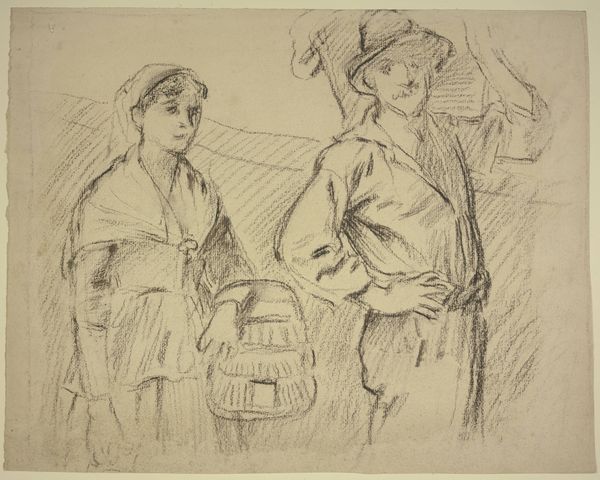 Otto Scholderer rendered 'Farm workers returning home' in charcoal and white chalk on paper. Scholderer created this image during a period marked by significant social and economic change in Europe, including the rise of industrialization and the persistence of agrarian labor. The artwork offers a glimpse into the lives of rural workers, a segment of society often overlooked in traditional historical narratives. The workers depicted here are returning from a long day's work in the fields, their postures conveying a sense of exhaustion. We see their simple clothing and tools of their trade, emphasizing the physical labor involved in agricultural work. The composition seems to capture a fleeting moment, as if the artist sought to preserve a record of this ordinary yet vital aspect of rural life. The artwork invites us to reflect on the dignity and resilience of these workers, whose labor sustained communities and shaped the landscape.