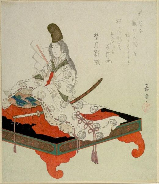 Curator: Let’s turn our attention to Takashima Chiharu’s “Bugaku Dance,” a shikishiban print housed here at the Harvard Art Museums. It depicts a dancer with a sword, assuming a dramatic pose. What strikes you first? Editor: The tension! The diagonal of the sword against the figure’s kneeling stance creates such a dynamic composition. It feels active, almost aggressive. Curator: Woodblock prints like this one were, of course, a commercial venture. We need to consider the skilled labor involved in carving the blocks, the paper production, and distribution networks that made this affordable art. Editor: Absolutely, and we shouldn't separate that from the cultural context. Bugaku dance was historically performed at the imperial court, and later became more accessible. This print perhaps signifies a desire for broader participation in elite art forms? Curator: A fascinating thought, indeed. The materiality, the way the ink sits on the paper, gives it a depth despite its relative simplicity. Editor: And the dance itself, even in this static image, embodies resistance—challenging societal norms through movement and expression. Curator: So, we're left with a complex interplay of production and performance, each informing our understanding of this visually compelling work. Editor: Precisely. It’s about who gets to participate in culture and how we interpret those performances today.