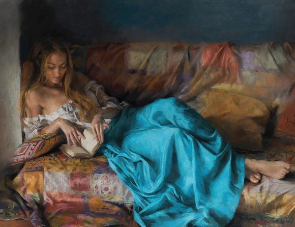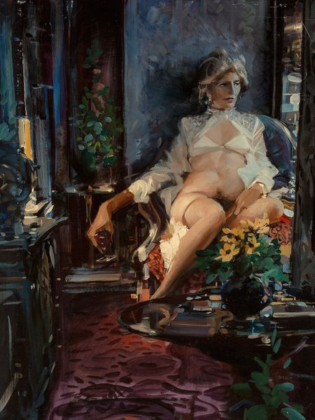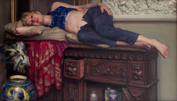 Nelson Shanks made this painting, Predator, using oil paint to conjure up a kind of luxurious domestic scene, but with a strange twist. He’s using pretty traditional techniques but somehow the end result feels both contemporary and a bit unsettling, right? Check out the texture in the painting, especially in the fur details. There's something so physical about the way he builds up the layers of paint; you can almost feel the roughness of the fur and the softness of the cushions. He also has these moments of intense detail, like in the model’s face, which make the looser, more expressive areas, like the brushwork on the carpet, feel even more lively by contrast. It makes you wonder what he wants you to really *look* at. There’s an interesting push and pull going on in this piece between representation and abstraction, which you also see in Lucian Freud’s work. It’s like he’s inviting us to question what we see and how we see it. So is it a domestic scene, or a theatrical stage set? Is it about power, vulnerability, or something else entirely? It’s up to you to decide.