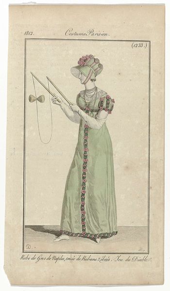 Pierre Charles Baquoy created this print, entitled *Redingote de Lévantine Rattachée par une Echarpe*, in 1810 using engraving and etching techniques. These processes involve cutting lines into a metal plate, inking the surface, and then using a press to transfer the ink onto paper. The image shows a fashionable Parisian woman wearing a "redingote," or riding coat. The delicate lines define the texture and drape of the fabric, while the added color highlights the garment's fashionable cut and style. The print was part of a series documenting contemporary fashion, catering to a growing consumer culture interested in the latest trends. Consider the labor involved in producing both the print and the clothing it depicts. From the skilled engraver creating the plate to the artisans producing textiles and garments, this image offers insight into the industries and skilled traditions that were prevalent in the 19th century. By focusing on materials, making, and social context, we gain a deeper understanding of the artwork, bridging the perceived gap between fine art and craft.