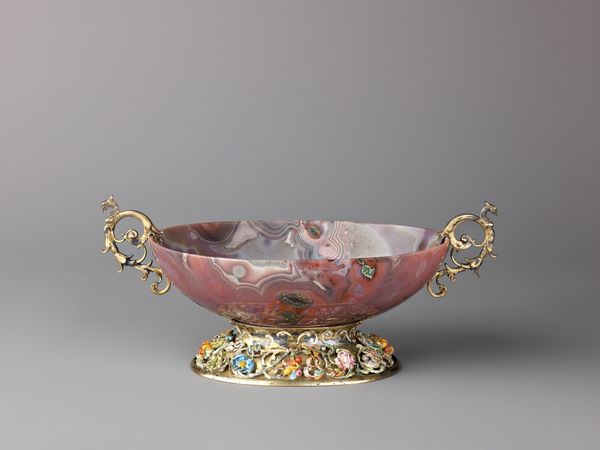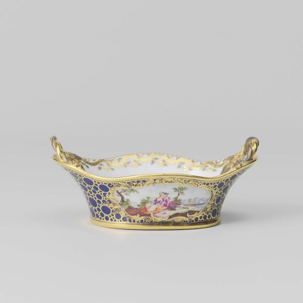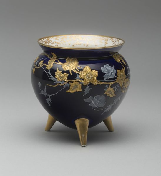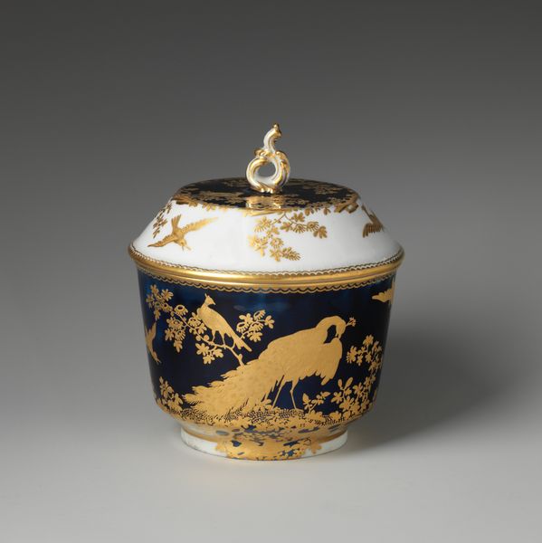Curator: This is a porcelain punch bowl crafted around 1765 by the Chelsea Factory. You can find it at the Art Institute of Chicago. The piece reflects the Rococo style with its delicate design and elaborate decoration. Editor: It’s absolutely beautiful! That rich cobalt blue against the gold filigree just oozes luxury. It makes me wonder about the kind of hands that shaped this, and the labor behind it. Curator: Indeed, Chelsea porcelain, particularly during this period, was very popular among the wealthy elite. It reflects the aspirational tastes of the time, doesn't it? Social gatherings centered around these kinds of ornamented, eye-catching pieces. Editor: The hand-painted birds too—so elegant and almost dreamlike. It’s a fascinating study in how objects of consumption became markers of social status. One can only imagine how labor-intensive creating this form was at the time. And what minerals were traded across seas for the raw materials? Curator: Precisely, the symbolism of such detailed work elevated its perceived value, embedding the object within a circuit of social exchange, and therefore bolstering its political function. How fascinating that artisans so clearly expressed their position via these materials! Editor: Looking closely, the subtle variations in the surface remind us it’s a crafted object, not just a perfect reproduction. There's a whole network of work and human choices embodied in the smooth glaze of this ceramic piece. It feels far from static. Curator: Agreed! By looking into the decorative elements as well, you understand the socio-economic context in which it came into existence, along with allusions to British aristocratic taste. Editor: I think it’s this inherent contradiction between artistry and manufacturing which reveals so much about how tastes were being shaped, even commodified, within those circles at the time. Curator: An exquisite object indeed—a convergence of artistry and social dynamics. Editor: Absolutely, an intricate tapestry woven with labor, materials, and societal desires.