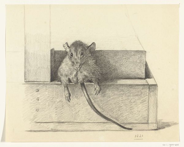 Editor: Here we have Jean Bernard's "Muis, naar rechts," or "Mouse, to the right," a pencil drawing from around 1775-1833, housed at the Rijksmuseum. It’s quite a detailed rendering for what appears to be a simple sketch, and there’s almost a stillness or quietude to it that I find striking. What catches your eye in this piece? Curator: The formal elements are certainly compelling. Observe how Bernard uses subtle gradations in pencil to create a remarkably lifelike depiction of the mouse. The texture of the fur, the delicate shading that defines the form, and the way light falls across its body—these contribute to the drawing's inherent visual interest. How do you interpret the stark contrast between the detailed subject and the empty background? Editor: I hadn't considered the relationship between figure and ground quite like that. The void almost amplifies the realism of the mouse itself. It does raise a question though; is that emptiness a comment, or merely a function of the medium? Curator: Perhaps it functions as a deliberate compositional choice to isolate the subject, thereby prompting close attention to its intrinsic form and texture. Is it not interesting that there are no overt symbols at play here, rather the aesthetic qualities that reside in line, form, and value? Editor: That's true; the reduction to pure form and texture makes you consider the humble subject matter differently. Thanks; I am paying more attention to the artistic decisions now. Curator: Indeed. Close viewing such as this, is essential for us to consider the interplay of artistic skill and the seemingly simple subject matter, thereby uncovering nuanced perspectives and creating fresh vantage points to create understanding and unlock a deeper artistic significance.