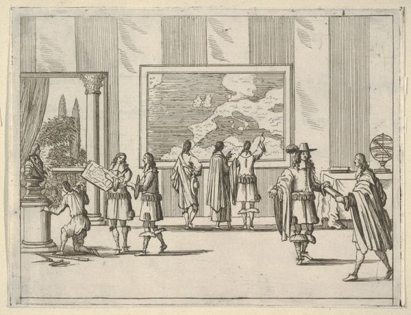 Editor: This etching from 1659, by Bartolomeo Fenice, is titled "Francesco I d'Este Takes Particular Care to Ensure that Justice is Observed." I'm struck by the formality of the scene, the way the architecture seems to box everyone in, despite the promise of justice. What grabs your attention when you look at this? Curator: The tension between the stage-like setting and the raw depiction of power. Doesn't it remind you of a theater set, all columns and imposing figure? Yet, the lines are so fragile, like the etching barely contains the scene's energy. What do you think Fenice is trying to say by staging the Duke in this manner, almost flaunting his power so deliberately? Editor: Perhaps the very act of "ensuring justice" becomes a performance? I mean, look at the Duke's posture—it's so theatrical! Is it about actual fairness, or simply the appearance of it? Curator: Precisely! And consider the history; Fenice made this print as part of a series idealizing Francesco I d’Este. Can we trust an image created with a specific agenda? Maybe Fenice is inviting us to question the very nature of princely "virtue" that's on display. How does that sit with you? Editor: It feels…cynical, almost. But smartly cynical. This print makes me want to read between the lines. So much propaganda back then – fascinating and disturbing! Curator: Propaganda, perhaps. Or perhaps, artful commentary disguised as propaganda. It dances between reverence and critique. Editor: I never thought I’d find so much to unpack in such a small etching. Thanks! Curator: The joy of art, my friend, is precisely this continuous unraveling. The dialogue never truly ends.