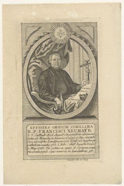 Curator: The somber, almost spectral quality to this portrait truly captures your attention. Editor: Absolutely, that skull gives me the shivers. A stark reminder of mortality staring right back at you! But let's get to it. Georg Heinrich Werner created this engraving of Placidus Muth sometime between 1785 and 1789. It’s currently held at the Rijksmuseum. Curator: The inclusion of the skull and books definitely anchors this image with established symbolism—death, wisdom, knowledge... The objects tell us so much. Editor: More than just personal iconography. As Abbot, Muth probably used visual cues to solidify institutional power. I mean, he wants you to remember the Church *and* the transient nature of earthly life! A bit on the nose, wouldn't you say? Curator: The Baroque loved that drama! The oval frame, draped curtain, ecclesiastical garb—these details communicate specific messages about identity and order. Even the meticulousness of the engraving conveys precision and hierarchy. Editor: All true, and the text etched into the bottom lends even more context. Look closely, it outlines Muth’s multiple roles, which emphasize the institutional layers he represents: Abbot of the Monastery, Theological Assessor, University Rector. No room for modesty, it seems! Curator: Well, these formal conventions create an enduring portrait—a vessel carrying cultural memory beyond an individual. Look at the geometric construction of his gaze in conjunction with the skull and his garments. What is time within such precise lines? Editor: What is time? Ha! Always a question for us. I find this image really revealing in terms of power structures inherent in religious and academic life during that time period. It seems deliberately crafted to ensure this guy would not be forgotten. And, well, we're here talking about him, centuries later. Curator: Right, his persona solidified into art; perhaps an early form of what we now consider image crafting and media shaping. What endures after us? The question embedded within. Editor: Indeed, maybe he would be surprised we're focusing less on his holy wisdom and more on how skillfully he branded his image. A final layer of irony to consider!