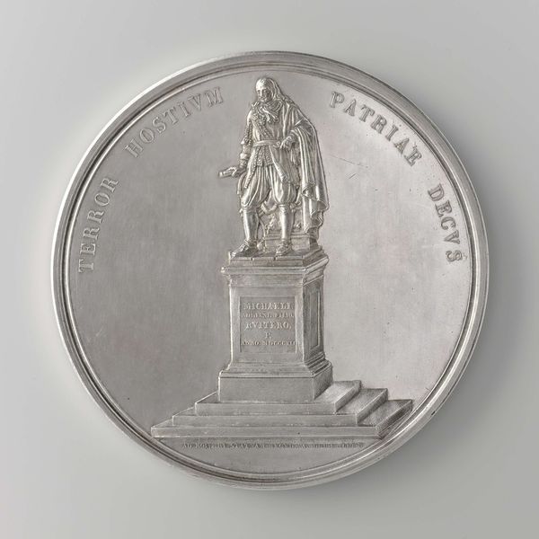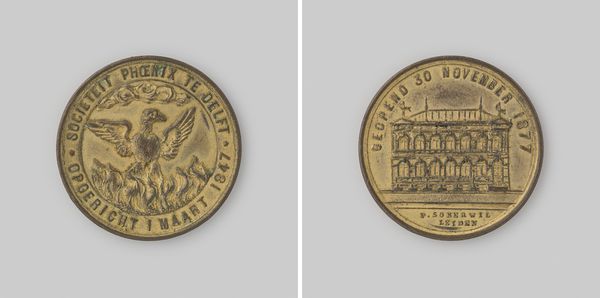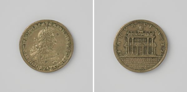 Editor: We're looking at "Honderdjarig bestaan van de Burgerlijke Wetgeving 1938," a bronze relief sculpture created by Johannes Cornelis Wienecke. It’s currently housed here at the Rijksmuseum. It has such a formal, stately presence... a little imposing, almost! What strikes you about it? Curator: Imposing is a great word for it. It’s so self-assured, isn't it? This piece to me feels almost like a little stage. Notice how the building sits atop these raised steps. A building celebrating law is lifted above, set apart for the viewer. You almost feel like you are approaching a classical play. Also note, this sculpture was created on the eve of WWII in 1938, as dark clouds are approaching over Europe, it’s like a statement of enduring order. Do you feel that? Editor: I do! The radiating lines above the building almost feel like... well, like rays of hope, even, fighting against those clouds. The chains bordering the sculpture - do they play into that feeling of order as well? Curator: Good question. Chains are interesting, aren't they? Are they binding or holding together? Given the context of the time, and what is being honored, I would say they act as ties to the rest of society. Law connects. Which makes you consider…what is truly holding us together? It is something physical, or some agreed idea or belief? Editor: That's fascinating. I hadn’t considered the chains in that way at all. It’s like the sculpture is asking you to think about the very foundations of society. Curator: Exactly. Art is rarely passive, right? I always consider what a piece makes me consider about my world and values. Hopefully that's what pieces like this make others do, as well. Editor: Absolutely. Thanks so much for that perspective. I feel like I see so much more in it now.