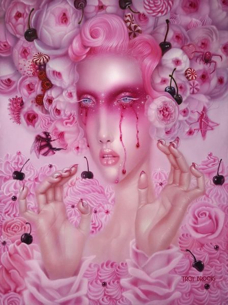 Curator: Welcome. We’re looking at Troy Brooks’ work, titled "Dear Francis, My Bleeding Heart". I’m always drawn in by his pop surrealism. What are your first impressions? Editor: Overwhelmingly pink, wouldn’t you say? It’s the kind of pink that seems to scream both 'luxury' and, paradoxically, some kind of hidden threat. All that sickly sweetness... It feels like an indictment of something. Curator: The dominance of this saccharine hue, combined with his distinctive figuration, is certainly jarring. The girl at the center has his trademark aesthetic: these big, exaggerated eyes, doll-like face, like she might be both enticing and terrified. Editor: The reference to Francis… Francis Bacon, I presume? And if so, what’s with that nightmarish visage looming in the background? It looks like a portrait after a particularly rough therapy session, mirroring something monstrous within. It echoes Bacon’s portraits, raw and unflinching. Curator: Perhaps Brooks feels connected to the late artist's emotionally honest approach, exposing that rawness with equally skilled brushwork, even amidst this sugary fantasy. It is painted in acrylic paint, which offers a fascinating level of control in such intricate scenes. Editor: It is as if Brooks is taking the aesthetic of beauty, perhaps critiquing contemporary feminine ideals, and subtly disrupting them. The raspberry blood splatters are a stark intrusion – violence against delicacy. A subversion of the superficial perhaps? Curator: Indeed! Brooks isn't shying away from those undercurrents, suggesting that all the sweet aesthetics in the world can't mask the melancholy simmering underneath. Editor: Or perhaps suggesting something dangerous can always hide beneath pretty things. All those pink things... something of Hansel and Gretel. That is probably how it is with memory, the sweetest things may also carry a subtle feeling of something dreadful that happened in the past. Curator: Well, this glimpse behind the facade gives us quite a lot to think about. What at first appears purely ornamental holds considerable depth upon closer inspection. Editor: Absolutely. The echoes and hidden connections of visual memory make us really perceive it is a multifaceted world that we carry inside, even within all that pink.