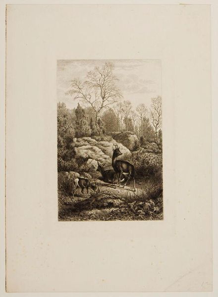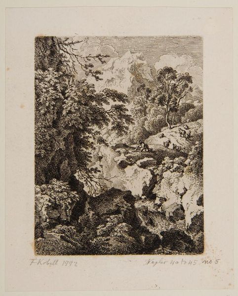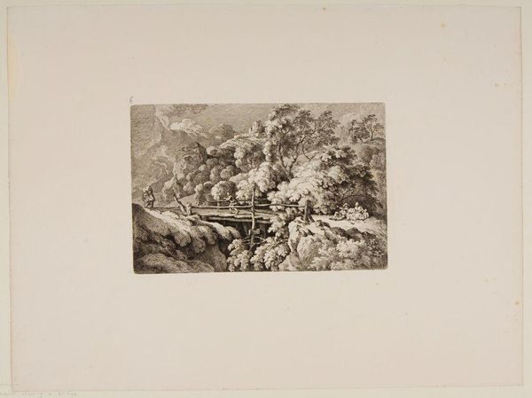 Editor: This print, "Landscape with Tivoli in the Background" by James Mason, feels like a memory, a faded postcard from the Grand Tour. The landscape is so meticulously rendered, almost dreamlike. What do you see in this piece? Curator: I see a longing, a yearning for a classical past viewed through a romantic lens. Mason's technique, the etching, it’s almost like he's sketching a scene half-remembered. Do you notice how the light guides your eye? Editor: Yes, it leads from the foreground figures up towards the distant Tivoli. It's like a journey. Curator: Exactly! And isn't it interesting how Tivoli, a place of ruins, becomes the ultimate destination? The past is never truly lost. Editor: That makes me think about how we create our own landscapes of memory. Thanks for sharing your insights! Curator: My pleasure. It's lovely to see these old stones sparking new thoughts.