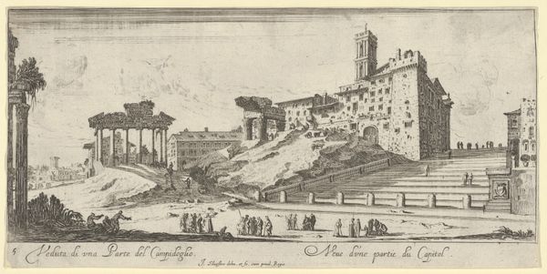Curator: This is Israel Silvestre's "Veduta di Campo Vaccina," an etching dating from between 1640 and 1660, depicting the Roman Forum. What's your immediate response to it? Editor: Bleak, but intriguing. There’s a sparseness to the etching technique itself which mirrors the desolation of the ruins depicted. It gives me a sense of the labor, I think, both to build these ancient monuments and to engrave their ruins later. Curator: Absolutely, and that bleakness, as you put it, is fascinating. We see these Roman ruins repurposed as a cow pasture, a 'campo vaccina'. It highlights the displacement of historical significance by everyday practicalities. The politics of space, if you will. How Rome has been used and reused across time. Editor: And Silvestre is deliberately showing us the 'making' and 'unmaking' simultaneously, I feel. Look at the etching—the dense, deliberate lines defining the structural decay and those three standing columns—those suggest time’s heavy hand and labor lost, turned to ruin. Curator: Precisely. The architectural details and perspective are meticulously rendered, yet the overarching impression is of abandonment and transition. We must also think of Silvestre’s intended audience, usually wealthy northern European tourists. These prints brought a piece of Rome back home, filtered through a specific, constructed gaze. Editor: Ah, so commodification even then! And thinking about it, the physical process of etching – the acid, the metal plate, the press – allowed for reproduction and wider distribution of this ‘Roman experience.' This makes it much more than just a picturesque scene. Curator: Exactly! It embodies the burgeoning tourism industry of the period, revealing how Rome and its past became consumable commodities, carefully curated through prints like this. These prints helped solidify a certain idea, or myth, of Rome, packaged for a specific audience, influencing perceptions for centuries to come. Editor: That’s given me so much more to consider about how labor shapes meaning – both in the image, and the production and consumption around it. Curator: Agreed. By unpacking the image's context, we can begin to challenge the assumed narratives and unveil power structures.