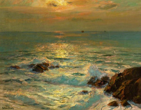 Albert Julius Olsson made this painting, Summer Sea, Newquay, Cornwall, with oil paints. Olsson uses marks and hues to build up a rich, textured surface. The brushstrokes feel intuitive, like he's responding to the rhythm of the waves. The paint isn't overly thick, but you can still sense the physicality of the medium. It's like he's layering light itself, catching the sun's reflection on the water. Look at how the paint seems to drag on the rocks on the lower right side of the painting; a kind of material echo of the water itself. This kind of movement reminds me of Monet, but there's also a uniquely personal touch here. Olsson isn't just recording what he sees. He is showing you what it feels like to experience a Cornish summer, how it lives in your memory. For me, it embodies the notion that art is always a conversation, a playful exchange of ideas, always open to new interpretations.