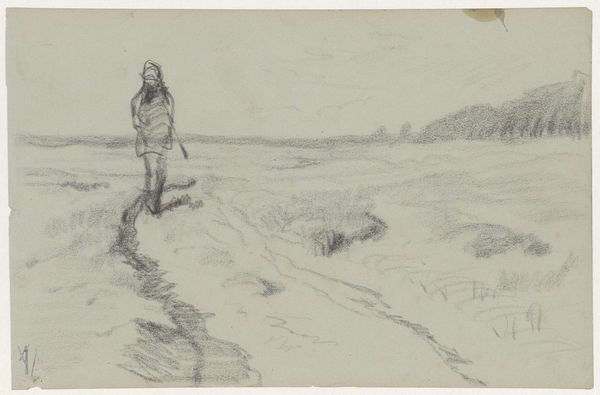 Curator: Looking at "Along the Marne," created circa 1918 by Jean-Louis Forain, a drawing rendered in pencil, my first thought is the overwhelming sense of quiet desolation. It's a battlefield stripped bare. Editor: Yes, that quiet is powerful. The sparse lines, the emptiness, all achieved through what appears to be fairly economical use of pencil on paper, right? It really underscores the material scarcity likely present during wartime. Curator: Precisely. The sketch-like quality emphasizes its production. We see not just an image, but a physical artifact, reflecting the context of World War I – resources diverted, labor focused on war, and Forain as both an artist and a participant in documenting that moment. It suggests something made quickly, possibly on the front lines, raw and unadorned. It evokes that tension. Editor: And Forain perfectly captures that. He wasn't just passively recording. There’s this soldier looking out over the ravaged landscape, helmet prominent, as if to remind himself, or maybe us, of humanity amidst this mechanized madness. Curator: He does not look out confidently, I see a kind of bewilderment. The quick pencil lines denote a ravaged land—strewn debris in the midground and barren hill in the background; it all reflects the sheer scale of industrial war as resource consumption, landscape transformation. Consider the symbolic consumption too—shattered illusions, devastated psyches reflected on that desolate beach. Editor: That figure almost looks translucent. The soft pencil strokes render him ghostly, as if he, too, is already a memory, fading into the scene he surveys. And the beach! Is that really a beach? Or the site of unspeakable tragedy... It reminds me of the burden of witnessing such trauma, transformed into artistic statement. Curator: The figure's rendering indeed points us towards more than merely documentation, but a mediation on loss; even the artist is working within resource limits. Perhaps a deliberate stylistic restraint. Editor: Yes, it invites that conversation. The deliberate restraint serves both aesthetic and deeply emotional functions, mirroring, perhaps, the repression of traumatic experience in order to endure. Curator: What's clear is this artwork underscores the intricate intersection between artmaking, materiality, labor, and cultural representation that complicates even the most seemingly simple sketch. Editor: Well put. It seems Forain, with very minimal materials, has left us contemplating quite profound things.