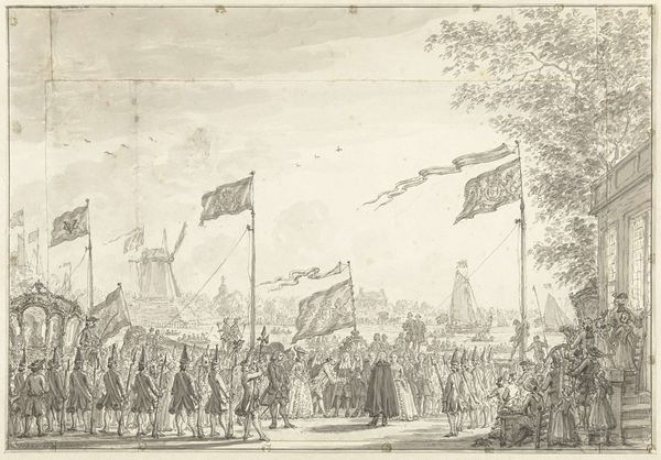 Editor: This print, "Onderhandeling tussen afgevaardigden van Amsterdam en graaf Willem Frederik bij Hofstede Welna aan de Amstel, 1650," by Simon Fokke, was made between 1754 and 1755. It depicts a negotiation. It feels very ordered, everything carefully placed... what do you see in this piece? Curator: It’s fascinating how Fokke chose to represent this historical event, placing such emphasis on the landscape. Consider the house, almost disappearing into the trees. How does that contrast with the figures so meticulously presented? Editor: It makes them seem like they're performing something, like putting on a historical play rather than just, you know, existing. Curator: Precisely. Fokke utilizes symbols recognizable to his audience, such as the flags and weaponry, reinforcing ideas of power, civility, and perhaps even subtle tensions between the negotiating parties. These emblems tap into a collective memory of political maneuvering. What emotions do these symbols stir in you? Editor: Ambivalence, I think. It's supposed to be this grand historical moment, but everything feels very… constructed. Curator: Exactly. The construction itself becomes the message. By framing the scene so deliberately, Fokke isn't just illustrating history. He’s also telling us how to remember it, selectively showcasing what he considers valuable for future audiences, carefully crafting a legacy. Does it give you a different way to read such images? Editor: Definitely. I hadn't considered how much the artist's choices shape how we understand the event itself. Curator: Understanding that subtle yet very powerful manipulation transforms our relationship to history itself.