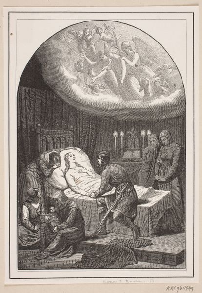 Taras Shevchenko made "Gifts in Chyhyryn in 1649" with etching in 1844. The intricate lines and tonal variations of the figures and interior spaces have been achieved through the careful application of acid to a metal plate, demonstrating Shevchenko’s mastery of printmaking techniques. Notice how the textures and details bring the historical scene to life. The medium allows for the creation of multiple identical images, which democratizes access to art, making it available to a wider audience than unique works like paintings or sculptures. Printmaking processes also allowed for the wide distribution of images, serving as a tool for disseminating political messages, raising awareness about social issues, and preserving cultural heritage. Consider the labor involved in the creation of this print, from the artist's hand drawing and etching the image onto the plate, to the printer's skilled work in producing the final print. This engraving transcends traditional notions of fine art, highlighting the social and cultural context in which it was created, and showcasing the value of both artistic skill and technical expertise.