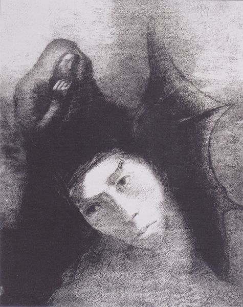 Curator: Take a look at Gustave Courbet's “Les amants dans la campagne” or "The Lovers in the Countryside", painted in 1844. It’s an oil on canvas, capturing a couple in what seems like a stolen moment. Editor: Stolen indeed! I immediately feel this charged atmosphere—the muted colors and close framing lend a certain urgency. Are they running away? Are they in hiding? There's so much drama! Curator: Interesting you pick up on that. Some see it as a simple romantic portrayal, typical of Romanticism at the time, with its focus on emotion. Editor: Emotion definitely dominates. But their shadowed faces and the dense darkness behind them, it makes me think of classical myths: illicit affairs and whispered secrets beneath the cover of night. Is it possible it shows secret lovers ? Curator: Courbet would later become known for his realism, rejecting Romanticism. But here, the idealization is present, don't you think? There's a certain formality in their posture, and he even painted her with what looks like a romantic neck ruff ! Editor: That neck ruff strikes me as almost defiant in this context. Given Courbet’s later rebellious streak, could it be he's consciously subverting the image of the innocent couple, hinting at something more complex beneath the surface? Look how similar the shadows of their profiles looks as they are both looking in the same direction. Maybe a call for action? Curator: Well, at this point, Courbet was quite young and still exploring different styles, definitely influenced by what came before. This painting precedes his later social critiques; maybe it's an early exploration of themes of personal liberty through the lens of romantic intimacy. Editor: Perhaps a bit of both! It's that ambiguity that keeps me engaged. Romantic ideals clashing with a foreshadowing of his later realism. This almost hidden but well depicted neck-ruff is what remains in the viewer mind. It reminds everyone about their younger self trying to defy established norms with basic symbolism! Curator: Exactly, that tension makes it more interesting than a simple portrait of young love. Editor: And gives us a hint of the iconoclast to come!