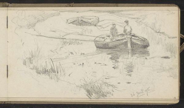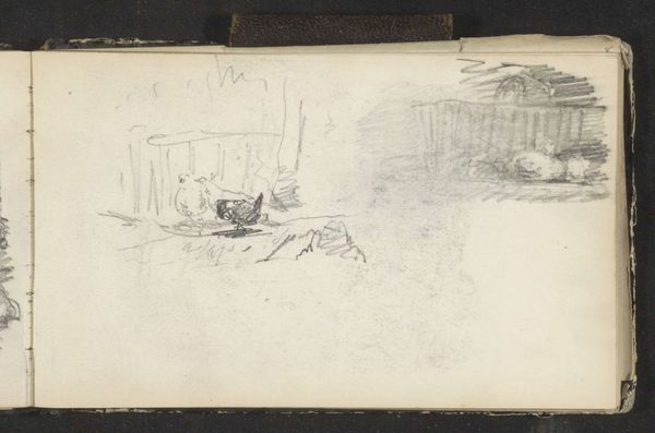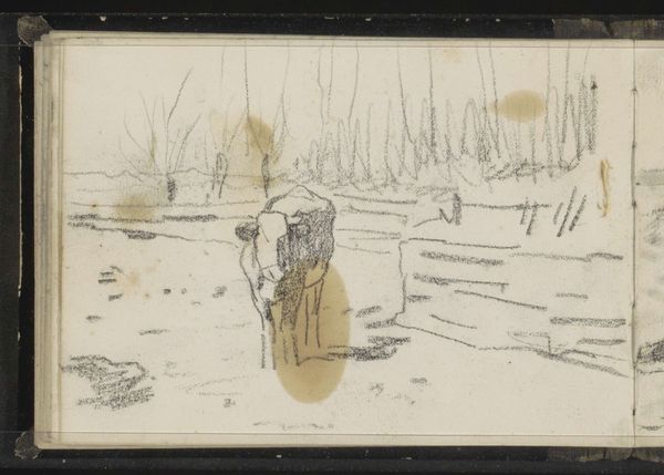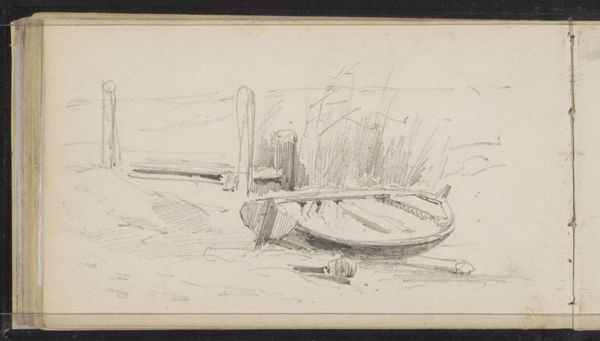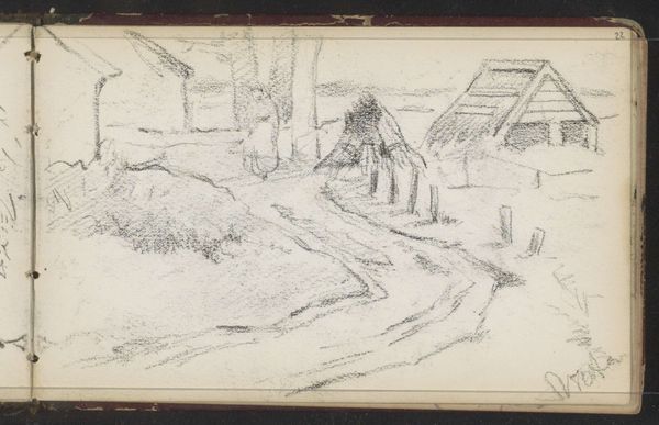 Curator: This drawing, titled "Landschap met sprokkelhout," roughly translated as "Landscape with firewood," is attributed to Anton Mauve and was created sometime between 1848 and 1888. It's currently held here at the Rijksmuseum. Editor: It feels immediate, doesn’t it? A raw, almost casual sketch. The charcoal… or is it pencil? creates such a moody, muted atmosphere. There’s a stillness to it. Curator: Absolutely. And that immediacy is key. This work offers us a glimpse into Mauve's process. The rapidly sketched lines reveal more than just a landscape; they display his quick notation of the world. Think about the rise of Impressionism during that time; such on-the-spot sketches paved the way. Editor: Looking closely, you can really see the hand of the artist at work. The hatching, the smudging, the varying pressure of the pencil, all build texture. It speaks to me of materiality - the artist engaging directly with the paper. It gives you insight into the way labor operates here. Curator: It's more than mere transcription; the arrangement, the subtle variations in tone, those choices invite interpretation. Notice the pole that supports what seems to be a lantern on the bank, which speaks to an almost melancholic interpretation on what otherwise appears to be simply a pile of logs in a clearing. Editor: You’re right, and that dark lantern introduces a new layer. How were resources, even light, acquired and utilized in this rural landscape? Was this simply firewood collected by someone who was less affluent than the artwork's intended audience? It makes me want to trace where the materials, the firewood and the manufactured elements come from. Curator: It provokes all kinds of questions, and allows us to interpret it within its socio-cultural setting. Editor: Looking at Mauve's sketchbook from a materialist perspective, what seems like a simple scene reveals questions around production, labor, and everyday life in this particular context. It turns landscape into something with its roots sunk deeper into a social matrix. Curator: Well said. Ultimately, whether viewed as a quick study or a social document, this "Landschap met sprokkelhout" encourages us to slow down, to look closely, and consider the many layers embedded within a seemingly simple landscape. Editor: It's a humble sketch, perhaps, but it’s also an invitation to delve into the labor of artmaking, and also labor as simply being.