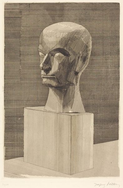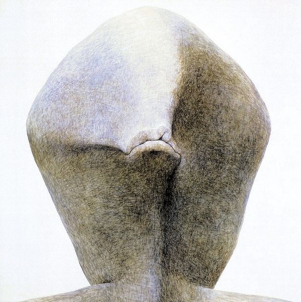 Editor: This is an untitled graphite and pencil drawing by Zdzislaw Beksinski. The monochromatic tones and the seemingly hollowed-out features give it such a somber feeling. What do you see in this piece? Curator: Well, immediately I'm struck by how Beksinski, who lived through immense political and personal upheaval, often grappled with themes of existential dread. Consider the period he lived in, under a repressive communist regime in Poland; that anxiety, I believe, is palpable here. The face seems both present and absent, solid yet dissolving. Do you notice the geometric shapes around the eyes? Editor: Yes, the eye sockets seem almost blocked by these strange rectangular shapes. Curator: Right. That blocking disrupts traditional portraiture, prompting us to question whose gaze this is, who it is for, and who or what it is seeing. Is it about state surveillance? Internal blindness? What do you think it evokes in a contemporary context? Editor: It makes me think of digital surveillance and how our identities are fractured and mediated through screens. There's something hauntingly relevant about it. Curator: Precisely. It’s a work that speaks to anxieties around identity and power. Its monochrome palette and damaged texture seem to mirror psychological damage from social pressure and lack of freedoms. The distortion he achieves, also raises the question: Does art have an obligation to accurately depict the subject? Editor: I never considered the broader themes related to Beksinski's life, it definitely opens up a whole new way to think about this piece. Curator: Indeed, art often invites us to see beyond the surface, engaging with the deeper currents of society and individual experience.