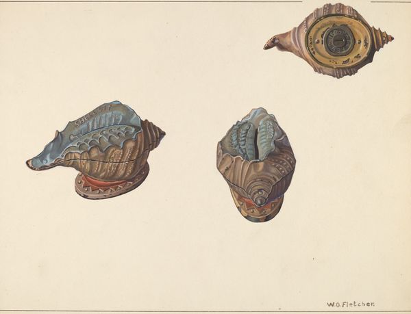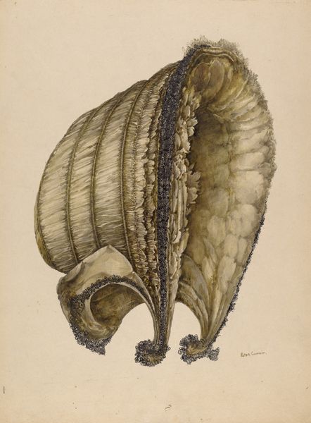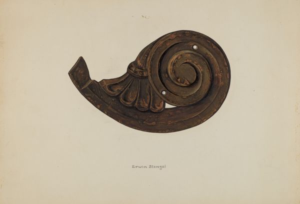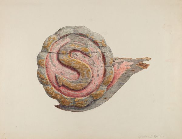 Editor: So, here we have Jane Iverson’s "Billethead from 'Myrtie B. Crowley'," dating back to around 1939. It’s a watercolor drawing, and I'm really struck by its textural detail and the almost fragmented quality of the form depicted. What do you see when you look at it? Curator: I see a representation of a specific cultural moment, specifically within the realm of architectural salvage and historical preservation. This work, labeled 'billethead', offers us a glimpse into the colonial revival movement gaining momentum at that time. Do you think it’s just an aesthetic study or something more? Editor: That's interesting. I hadn't considered the preservation aspect so prominently. Maybe it's about documenting a vanishing aesthetic. The choice of watercolor also makes me think of architectural renderings. Curator: Precisely! The "Myrtie B. Crowley" it references was a building. Iverson wasn't just recording a shape but memorializing a structure. What about the act of singling out and elevating a fragment to a place of its own in the visual arts? How do you view it? Editor: Isolating it like this forces you to really *see* it, almost like elevating a mundane object to art, similar to what the Dadaists did. By drawing our attention to a tiny detail, perhaps she makes us question the relationship between parts and a whole and invites us to engage with the materiality of history itself. Curator: Absolutely, that gesture reframes our interaction with history. This drawing speaks volumes about the value we, as a society, place on heritage, on fragments of the past, and on how we choose to remember – or even re-imagine – them. Editor: I never thought of it as speaking to such broad cultural trends. Now I see the historical weight it carries! Thanks for offering this new lens. Curator: My pleasure! Thinking about art through the lens of its cultural context always deepens our understanding.