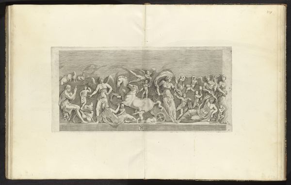Curator: Welcome. Today, we'll be looking at "Bas-relief met bacchanaal," an engraving dating back to between 1636 and 1647, created by Valérien Regnard. It's a depiction of a bacchanal scene, rendered with incredible detail. Editor: My initial feeling is... playful chaos! A tumbling throng of figures, grapes galore, definitely not your polite tea party! It makes me think of late summer, sun-drenched laziness and a touch of wildness. Curator: That "wildness," as you put it, is central to understanding these bacchanals. They were celebrations, often depicted in art, honoring Bacchus, the Roman god of wine, fertility, and theatre. However, beyond simple revelry, these events were spaces where social norms could be temporarily suspended. Consider who had access to public expression and spaces at this time; the suspension of decorum perhaps offered glimpses into broader social desires. Editor: Exactly! There's a feeling of liberation in their abandonment. Did someone say suspension of decorum? The artist is skilled. Look how he manages to imply depth within what is, in essence, a shallow plane, much like a sculpture carved in low relief. The lines buzz with energy, giving life to this little snapshot of Dionysian madness. Curator: Indeed. Regnard’s choice of printmaking as a medium further democratizes access to this image and idea. Unlike paintings accessible to only the elite, prints could circulate more broadly, sparking discussions – and potentially dissent – regarding cultural norms and the performance of identity. Editor: It's curious to see such an unruly scene contained within a classical composition and rendered with such precision. Makes me wonder if the artist himself secretly longed for a wilder life, or perhaps he simply understood its potent appeal to a wider audience. Is this an outsider observing a spectacle, or a participant trying to remember the details afterward? Curator: That tension is what makes this piece compelling. It allows viewers across centuries to engage with historical constructs of transgression, prompting us to consider the spaces where social boundaries are blurred. The enduring fascination with the "Bacchanal" suggests a continued interrogation of control and catharsis, a subject deeply embedded in the foundations of modern Western cultures. Editor: Well, that certainly gave me something to think about! I think I need a glass of wine...for artistic reflection, of course. Curator: And perhaps a touch of rebellious questioning to accompany it? Thank you for joining me today.