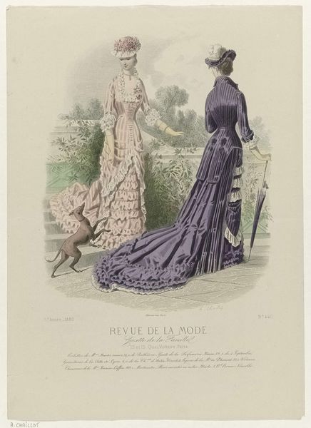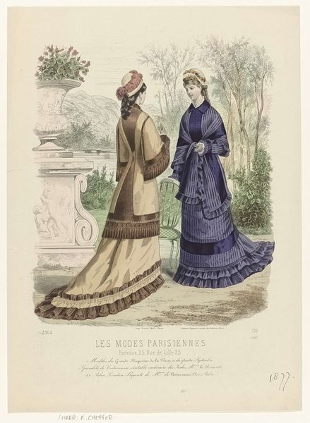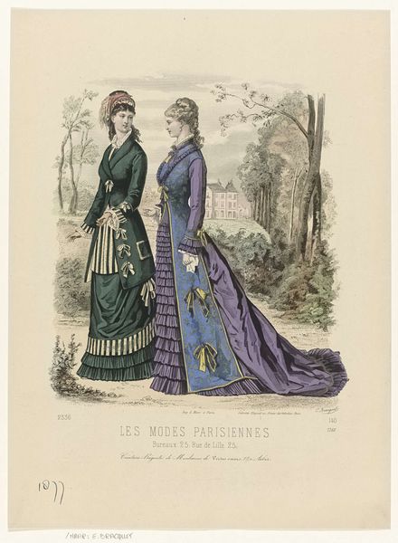 Curator: Oh, the chic of it all! These are two supremely dressed ladies, no doubt freshly scented, pausing for a promenade near what I presume is a Parisian park. It is an etching, drawing, print, really a delightful mixed-media piece titled *Les Modes Parisiennes, 1878, No. 1749*, which if I am reading the script correctly, is for Parfumerie Oriza of L. Legrand. Editor: There’s something undeniably melancholic about it though. The soft, diffused light gives it a dreamy, almost ethereal quality, as though this scene exists more as a wistful memory. Those vertical stripes almost give me vertigo as they narrow towards the back of the dress. Curator: It's definitely serving up romantic vibes. The women, observed from behind, as though we've accidentally stumbled upon a very private, very stylish moment. Each is an allegorical figure of consumerism; but in their shared pose, with hands touching, this speaks of a time just prior to all the mechanizations of modernity. Editor: Yes, allegorical figures indeed. The way they're positioned near the water; a lake? Bodies of water often represent the subconscious, don't they? Perhaps their stylish exteriors barely conceal what lies beneath. And those hats, rather demure. What kind of message did headwear signify for 19th-century women? Curator: I suppose what they literally covered up, what they let peek through the veil, so to speak, signified social roles of domestic tranquility while hinting at veiled desire and ambition. One can imagine these very ladies debating corsets versus, what... looser garments! While the men talk politics, the women forge fashion! Editor: Their dresses carry such symbolic weight; elaborate signifiers that broadcast to the world who they were, or perhaps, who they aspired to be. Like complex uniforms that hid and expressed the selves within. Curator: Yes! Perhaps what really seduces me is the implicit narrative. They are characters, you see, in the grand soap opera of daily life. The composition allows us to fantasize, as though glimpsing our own lives within theirs. It asks what roles do we play and what are we marketing. Editor: Perhaps that is why these types of portraits maintain such enduring allure for us. Echoes from another time... showing the past in very revealing and concealing fashions. Curator: It all does make you think. Thank you!
