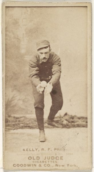 Curator: Before us, we have an interesting photogravure dating back to 1887. It’s part of the "Old Judge" series (N172) by Goodwin & Company, specifically "Roger Connor, New York Giants/Gothams" made for Old Judge Cigarettes. Editor: The sepia tones immediately evoke a strong sense of nostalgia. There's a kind of gravity to the image; his posture is very centered within the rectangle of the print. It speaks of both strength and expectation. Curator: The composition emphasizes geometric solidity; look at how the lines of Connor's body form intersecting angles that create a solid visual framework. Notice the texture, how the etching brings a tangible presence to the photographic material. Editor: Indeed. The image speaks volumes about the values associated with sports heroes during that period. Look how the "Old Judge Cigarettes" is featured. It is as much an ad as it is an image of Connor; both were clearly associated with positive manly attributes at the time. The photograph then becomes a potent symbol of aspiration. Curator: And let’s not forget that such printed matter functioned within networks of exchange. This material circulates through various collectors. Editor: Exactly, we now interpret the photogravure through the lens of modernity. While at first glance, this artwork reveals a strong baseball player of the New York Giants in the late 19th century, deeper introspection reveals that this man and product represented archetypes within its culture. Curator: Yes, a semiotic artifact to be examined and enjoyed across history. The simplicity and the complex story told is a feat on the photographer and Roger. Editor: Perhaps the symbols present in this piece, and in Roger, will change forevermore with time. I know my perspective on this one is sure to mature in the near future.