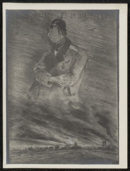 Editor: This poster, simply titled "Poster" by Erlor, features a soldier holding barbed wire. It's quite striking, but also unsettling. What underlying message do you think it conveys? Curator: It's crucial to see this image within its historical context. Posters like these were often tools for propaganda, idealizing war and encouraging participation. Who is represented here, and who is conspicuously absent? Editor: The soldier is clearly central, and the barbed wire seems symbolic, but I am unsure. Curator: The barbed wire stands as a physical and metaphorical barrier, but the poster encourages you to see him as a hero, while obscuring the realities of war. Consider whose interests are being served by this image and what stories are being left untold. Editor: That gives me a lot to think about regarding representation. Thanks!