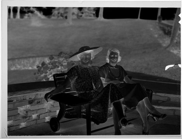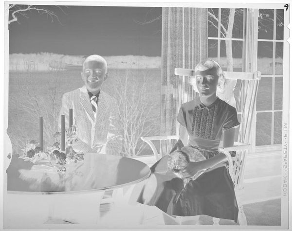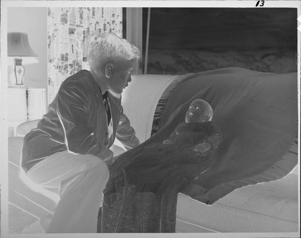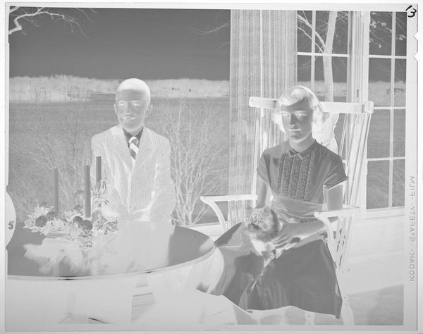 Editor: So, this is an "Untitled" photograph of a young man and woman on a couch, by Lucian and Mary Brown. It has a rather domestic feel. What draws your eye when you look at this image? Curator: Oh, the reversed tones create such a ghostly intimacy. It’s like peering into a memory, a world both familiar and strange. I imagine the Browns capturing a fleeting moment of connection, the blinds casting stripes of light and shadow. What do you make of the composition? Editor: It feels staged, but maybe comfortably so. Curator: Precisely! The arm around the woman's shoulders, the slightly stiff posture. It reminds me of old family photos, striving for an ideal that's just out of reach. I love how the negative image transforms the ordinary into something dreamlike. Editor: I didn’t expect to find so much in a simple snapshot. Thanks for sharing your insights! Curator: My pleasure. It's amazing how a simple image can evoke such complex feelings.