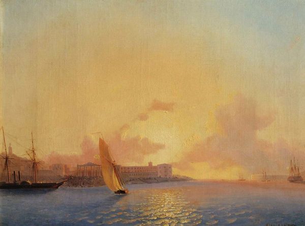 Curator: This is Ivan Konstantinovich Aivazovsky's "Smolny Convent," painted in 1849. Editor: It’s luminous, almost overwhelmingly so! The light feels thick, like honey glazing everything. Curator: Absolutely. Aivazovsky, famed for his seascapes, consistently presented imperial Russia in a particularly favorable light. Notice the golden sky over the Smolny Convent—how might we interpret that considering Russia’s history of autocratic power? Editor: I’m immediately drawn to the labor implied here, both in its making and depicting. How were the paints sourced, ground, and mixed? The ships too—think of the materials, the wood, the canvas. These are built objects. Curator: Right, we can delve into the raw materials used. But the political is also paramount. Think of the role the convent played, its link to female education during a time when opportunities for women were severely limited, all overseen, of course, by the state. This isn't a neutral portrayal of light; it's a deliberate construction. Editor: Constructed through pigment, though. Look at the way the light dances on the water. This wasn't spontaneously captured; this texture and the application represent considerable skill and a dedicated process. The materiality of paint creates the *idea* of light, reflective of the artist's expertise. Curator: Of course. But consider the narrative: a serene view that reinforces a carefully curated image of Imperial Russia— an empire often built on exploitation and oppression. The beauty is intertwined with power, deliberately obscuring certain social realities. The radiant glow softens the harsher edges of autocracy. Editor: I can agree on the visual softness that is evident within the piece, but looking closely, the brushstrokes used to create that very 'glow' are really visible, especially around the horizon, almost vibrating with their own energy. So, while softening a landscape overall, they add this almost tangible energy within the materials. Curator: An energy, yes, but an energy harnessed and directed toward reinforcing existing power structures through this romantic idealization of place. Editor: So, while this painting has layers of encoded imagery that might speak to control, we can't dismiss that labor, material, and vision created it. It brings another dimension to my reading of it. Curator: Indeed. This work reminds us of the power dynamics at play even in seemingly tranquil scenes, a dialogue necessary for considering visual art’s social function.