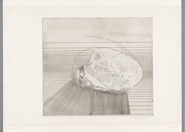 Editor: This is Dame Elisabeth Frink's "Horse's Head," held in the Tate Collections. It's a monochromatic image, almost ghostly. What can you tell me about its historical context? Curator: Frink's horses often reflect post-war anxieties. Consider the Cold War context: her powerful, yet vulnerable, animal forms resonate with societal fears and the ever-present threat of conflict. How might the public interpret such imagery? Editor: So, it's not just a horse; it's a symbol of broader social tensions? Curator: Exactly. The stark presentation, the absence of color, reinforces a sense of unease, inviting viewers to confront difficult realities reflected in the art world at the time. Editor: I see it now. Thanks. It’s more than just a portrait; it is a cultural statement.