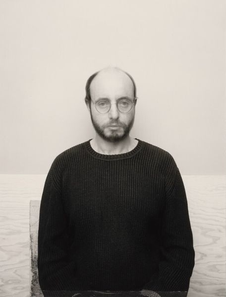 Curator: This arresting black and white photograph, created in 1994, is titled "Moses Wloski, Born 1921, Wolkowisk, White Russia" by Jeffrey Wolin. Editor: Wow. It's immediately impactful, isn't it? Stark. That close-up—you're right there with him. The darkness really emphasizes the weight in his gaze. Curator: It’s a portrait imbued with narrative. Wolin’s integration of text as a backdrop is striking. We see the subject, Moses, a survivor, his forearm bearing the visible tattoo. Then behind him, covering the wall, is his story written in longhand. Editor: It gives me chills! It feels like his memories are literally etched onto the world around him. And the way he’s holding himself… almost like he’s guarding himself, but also weary. Curator: The placement of that tattoo is deliberate. Numbers have always been potent symbols—a constant reminder, signifying loss of identity and profound trauma but also an emblem of survival against all odds. The number is forever branded to be seen, to witness. Editor: It's like he's shielding us from it with his crossed arms, but still, he makes sure it’s visible to give a glimpse into this story. You’re right – that pose… I feel like it captures so much complexity, from vulnerability to a deep resilience. What gets to me is how matter-of-fact it seems, which somehow only amplifies its devastating impact. Curator: Wolin’s use of stark realism ensures Moses' story—a story repeated countless times in different versions—is never forgotten. In terms of cultural memory, what visual element strikes you most profoundly? Editor: Definitely the number tattooed on his arm coupled with that haunted look. It transforms what might be a simple portrait into this whole document of a painful life experience. But somehow I find comfort seeing it recognized here. Curator: It's a challenging image, to be sure, a profound act of witnessing on both the part of the artist and the viewer. Editor: Exactly. Thanks for bringing that into view. It feels like we’ve connected with history itself today.