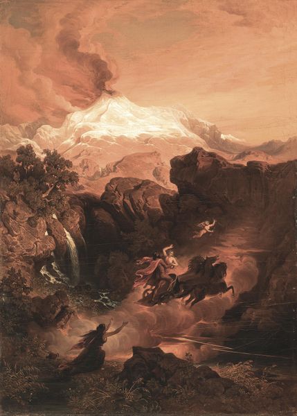 Curator: Let's turn our attention to Thomas Moran's dramatic interpretation of "Macbeth and the Witches," rendered with oil on canvas. Editor: Immediately striking is the palpable sense of unease—the scene seems to pulse with a kind of lurid energy. It’s almost as though the landscape itself is reacting to the witches' presence. Curator: Precisely. Observe how the composition emphasizes this disquiet. The tumultuous sky, dominated by fiery hues, presses down upon the jagged rocks and cascading water, creating a claustrophobic, almost theatrical space. The stark contrast between light and shadow further amplifies the drama. Editor: Absolutely, and that symbolic use of light can't be overlooked. Red typically means courage and passion, and, with that lurid tone, danger, violence, and wrath. The light creates drama, the dark is associated with death and the unconscious, as this painting draws from the famous tragic play by Shakespeare. Curator: Interesting. Now, directing our gaze towards the left side of the canvas, we discern the ethereal forms of the witches amidst a vortex of mist and spectral light, while on the right, Macbeth stands on the rocks with his expression hidden from the viewer as though nature itself witnesses their unholy communion. Editor: Note how Moran places Macbeth not at the absolute center of the artwork but on the edge, almost excluded from nature. Macbeth seems so unaware of the repercussions of the meeting, drawn in by ambition, pride, and wrath, and disconnected from spirituality as he stares off into the distance. This image of landscape thus acts as an illustration of Macbeth’s psychology. Curator: An astute observation. And look closely at the brushwork – see the application of pigment in short strokes to form an aggressive movement in nature with loose expressive touches. Editor: All right, I'll concede that even with such clear formal devices at work here, a landscape so evocative still triggers deeply rooted emotional and symbolic associations in the viewer. Curator: Indeed, a successful artistic strategy hinges upon effectively harmonizing both aesthetic form and profound cultural significance. Editor: Very well said. It leaves one pondering the interplay of free will, destiny, and the ominous power of the supernatural forces depicted here.
