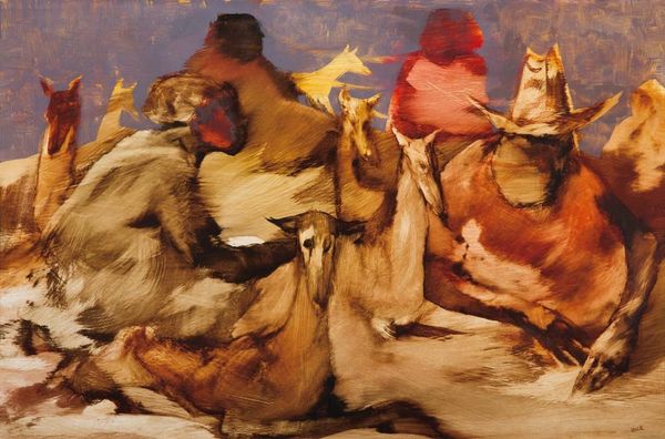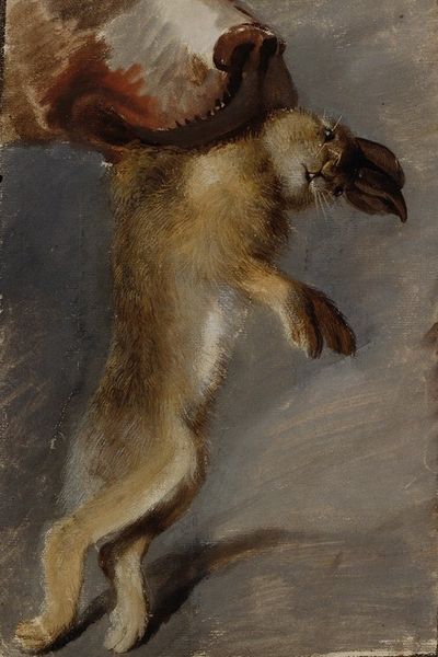 Editor: This is Alexander Roitburd’s "The Vision to the Youth Bartholomew," painted in 2010, using oil paint. The rough, tactile paint application gives it a compelling materiality, but the scene itself – two squirrels facing each other – feels almost dreamlike. What do you see in this piece, considering that title? Curator: The title casts a specific lens. Bartholomew, as in Saint Bartholomew, often associated with a spiritual vision. Look at the squirrels: they become less about realism and more about symbolic encounter. Think of animal iconography throughout history - foxes representing slyness, doves peace... Editor: So, the squirrels aren't just squirrels. Curator: Precisely. They become stand-ins, perhaps messengers in Bartholomew's vision. Their stance, almost a mirroring, suggests introspection, a dialogue with the self. What emotions does their mirrored stance evoke in you? Editor: I see a tension – a confrontation, but also recognition, maybe acceptance. The dark background certainly adds to a slightly ominous mood, almost as if the vision is occurring in a liminal space. Is there a specific tradition that Roitburd is referencing here? Curator: Roitburd plays with this tension, referencing Orthodox iconography with his style of realism, without depicting a traditional biblical narrative. He infuses mundane subjects – here, squirrels – with spiritual weight, prompting us to contemplate meaning in the everyday. This blurring of the sacred and profane marks his cultural commentary. Editor: That reframing gives me a new appreciation for how symbols and metaphors change over time. I had assumed this was a simple animal portrait, but it’s so much richer than that! Curator: Yes, a simple scene transformed by historical and psychological resonance, inviting you to construct your own “vision”.