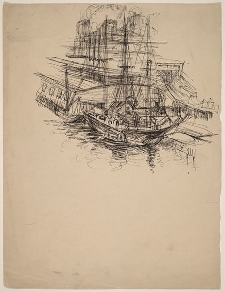 Editor: Here we have Paul Signac's "Sailboats near a Lighthouse", done with ink and watercolor. It’s so light and airy, despite the detail in the ships. It almost feels like a fleeting memory. What strikes you most when you look at this piece? Curator: Immediately, I'm drawn to the formal relationships at play. Note the carefully considered distribution of dark and light masses. The heavier vessel in the foreground is balanced by the lighthouse and distant ship, creating a satisfying visual equilibrium. Editor: I see what you mean. It’s not just a random scattering of boats; they really frame the lighthouse. Curator: Precisely. Consider also the calligraphic quality of the lines. Signac employs a limited tonal range, yet the varying pressure and speed of his strokes give depth and texture to the water, sails, and even the distant sky. Do you observe how the reflections echo, almost invert, the forms above? Editor: Yes! It's like a fragmented mirror. Curator: These repetitions create a visual rhythm, a subtle dance of form and light across the surface of the drawing. The economy of line is remarkable, achieving a sense of atmosphere with minimal means. Editor: It’s much more deliberate than I initially thought. I was focused on the scene itself, but you’ve shown me how the artist used these elements to guide the viewer's eye. Curator: Indeed. The true subject here may be not the sailboats, but Signac's masterful manipulation of line and form. Editor: I see it now, thank you. I’ll definitely look closer at composition in other works now, it seems that so much is embedded within that framework.